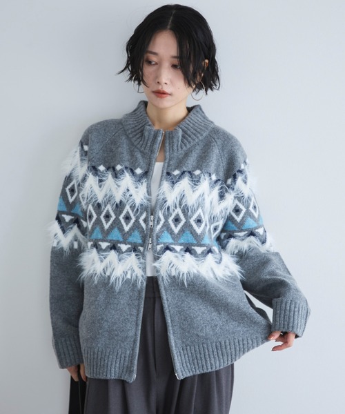 取り入れるだけでトレンドライクに着こなせるノルディックニット【point】・レトロな雰囲気が魅力的なノルディック柄ニット・ジャガード部分に毛足の長い糸を織り交ぜふわふわがアクセントに・ジップタイプで少しカジュアルな印象・前を開けて羽織りとしてはもちろん、ジップを上まで閉めてプルオーバーニット風に着るのもおすすめです・アウター代わりにうれしいサイドポケット付き【fabric】・軽くて柔らかな肌触り透け感:なし裏地:なし伸縮性:あり光沢感:なし生地の厚さ:普通【注意事項】・画像の商品はサンプルです。実際の商品と仕様、加工が若干異なる場合があります。・サイズ表記はあくまで目安となります。・取り扱いについては、商品についている品質表示でご確認ください。・照明の関係により、実際より明るく見える場合がございます。またパソコンなどの環境により、製品と画像のカラーが若干異なる場合がございますので、予めご了承くださいませ。■お気に入り登録がオススメです!■《商品のお気に入り登録》カラー・サイズ選択の横の「♡」をクリックで簡単に登録できます完売カラーの再入荷や在庫が1点になったとき、セールになったときに通知をお届けします《ブランドのお気に入り登録》ページ上部のブランド名の「♡ お気に入りブランドに追加」をクリックで簡単に登録できます新商品の情報やイベントなどお得な情報をいち早くお届けします是非、ご登録お願いします♪