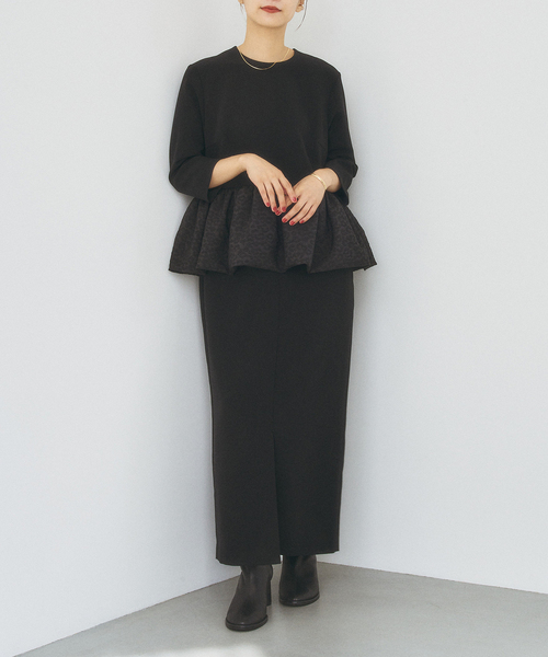 ― HARDY NOIR ― ブラックをメインとしたブランド「アルディー ノアール」 キーワードは「ブラックで女性は美しくなる」 カジュアルからフォーマルまでを提案するブランドです。 ワンピース(ドレス)を中心にデイリーに着こなせるセットアップや、人生の大切なシーンに着られるドレス、冠婚葬祭のフォーマルまで提案します。 ◆◆NOIR LINE オケージョン対応ワンピース◆◆ ※こちらの商品はブラックフォーマルではございませんが、冠婚葬祭とデイリー両方のシーンでお召し頂ける商品です。 ミニマルなIラインのボディベースに、身頃とは別生地のふんわりとしたペプラムをドッキングしたレディライクなドレス。 ベース生地はダブルクロスを使用しており、春の式典シーンやオケージョンシーンなどにも適した素材。 前後センターにスリットが入っているのがデザインポイント。 ペプラムはややハリ感のあるレオパード風のジャガード生地を使用し、立体感のある華やかなシルエットに。 袖丈は肘が隠れる七分袖で、袖以外には裏地が付いています。 オールシーズン、セレモニーシーンで着用いただけるワンピースです。 ********************** 透け感:なし 裏地:あり 伸縮性:なし 光沢感:なし 生地の厚さ:普通 ********************** 【スタッフ着用コメント】 《スタッフ》 身長:160cm/普段サイズ:36/着用サイズ:36 サイズ感:着丈はふくらはぎが隠れる位、程よく体に沿う感じのサイズ感でした。 素材感:厚すぎず薄すぎない、透け感の無いトリアセテートの程よくしっかりとした素材感です。 光沢感は無いですが、ウエストのフリル部分だけ違う素材を使っており、フリル部分は少しワッシャー感があります。 着心地:裏地が付いており、バックファスナーなので着脱もしやすかったです。 着るとそこまで窮屈感は無く、前後にスリットが入っているので足さばきはしやすかったです。 ********************** ※取り扱いについては、商品についている品質表示でご確認ください。 ※照明の関係により、実際よりも色味が違って見える場合があります。 またパソコン・スマートフォンなどの環境により、若干製品と画像のカラーが異なる場合もございます。 ※商品の色味は、商品アップ画像をご参照ください。 本体:ドライクリーニング