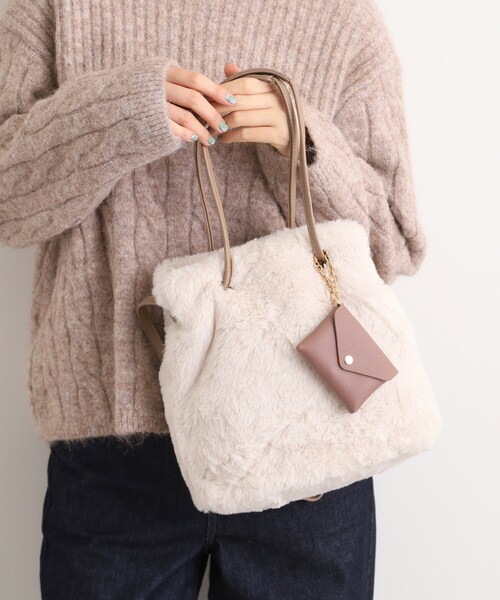 柔らかいエコファーを使用した、トートにもショルダーにも使える便利なチャーム付きショルダー 【デザイン】 巾着デザインの前部分の持ち手を持ってトートバッグに。 サイドを引くとショルダーバッグになり、使い方で1つ持っているとコーデの幅が広がります。 カラー展開も使いやすい柔らかい展開です。 取り外し可能な合皮素材のミニポーチチャームがセットです。 目薬やリップなど収納できます。 【仕様】 ・ポケット数:内側×3 ・ミニポーチ付き ※照明の関係により、実際よりも色味が違って見える場合があります。また、パソコン・スマートフォンなどの環境により、若干製品と画像のカラーが異なる場合もございます。 【25AW】 店舗へのお問い合わせ商品番号:769-04506 ●製品寸法: 00:高さ23cm 幅(上部)~26cm 幅(下部)26cm マチ11.5cm 持ち手上がり13cm ショルダー対応サイズ55~103cm ポーチH6.5cm ポーチW8.5cm ポーチD1.5cm 備考:重量:約285g(サンプルサイズ)
