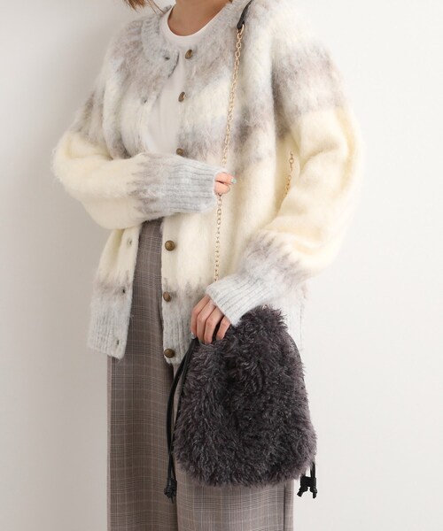 【デザイン】 柔らかく毛足の長いふわふわのプードルフェイクファーの巾着ショルダー。 ショルダーはチェーン使いでフェミニンに、肩部分は合皮で肩に食い込みにくくしています。 ショルダーは取り外し可能。 ショルダーを外し、巾着紐で持てる2WAY。 口元はマグネット付きで中が見えないので安心です。 【仕様】 ・ポケット数:内側×1 ※照明の関係により、実際よりも色味が違って見える場合があります。また、パソコン・スマートフォンなどの環境により、若干製品と画像のカラーが異なる場合もございます。 【25AW】 店舗へのお問い合わせ商品番号:769-04097 ●製品寸法: 00:高さ28cm 幅(上部)24cm 幅(下部)23cm マチ5cm 付属ショルダー全長109cm 備考:重量:約245g(サンプルサイズ)