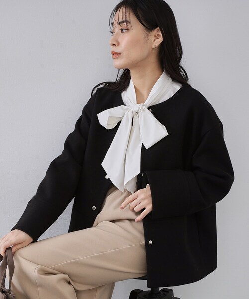 上品なシャンパンゴールドのドットボタンがポイント。シーンを問わず活躍するノーカラーコート。【デザイン】・シンプルでありながらも、計算された上品なシルエットが魅力のノーカラーコート。・きれいめスタイルはもちろん、ややボクシーなシルエットでカジュアルな着こなしも叶います。・シャンパンゴールドのドット釦を使用し、開けて着用した時も上品な印象に仕上げています。【素材】・ふくらみのある、柔らかなウール調のジャージ素材を使用。・ニードルパンチ加工を施し、圧縮ウールのようなふくらみとマットな質感を表現。・マシンウォッシャブルでご自宅でのお洗濯も可能です。【仕様】・ポケット数:横×2・裏地あり・前スナップボタン※照明の関係により、実際よりも色味が違って見える場合があります。また、パソコン・スマートフォンなどの環境により、若干製品と画像のカラーが異なる場合もございます。モデル情報:身長165cm B72 W57 H84 着用サイズ:38(M)店舗へのお問い合わせ商品番号:637-94888●製品寸法:36(S):着丈59cm B102cm 袖丈51cm 肩幅48cm38(M):着丈60cm B104cm 袖丈52cm 肩幅49cm40(L):着丈61cm B107cm 袖丈53cm 肩幅50cm42(LL):着丈62cm B110cm 袖丈54cm 肩幅52cm備考:重量:38(M)約655g