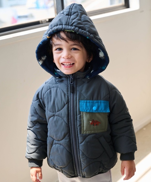 裏地にフリース素材を使用したリバーシブルタイプのブルゾンです。 表地には撥水加工をほどこしているため、雨の日のお出かけにもぴったり。 クッション感のある中わた入りで、あたたかい着心地に心惹かれます。 お好みに合わせてフードをつけ外しできるのも魅力。 可愛らしい恐竜をモチーフにした個性あふれるデザインです。 内側にお名前を記入できるタグつき。 【リンク】お揃い品番:5354407 【透け感】透けない 【生地の厚さ】普通 【伸縮性】なし 【裏地】なし 【ポケット】あり
