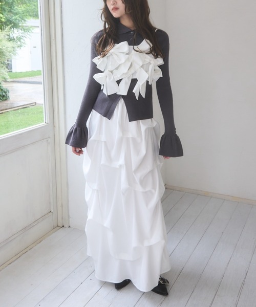 立体的なシルエットが印象的なランダムタックセットアップ。 ビスチェとスカートがセットになった、華やかで存在感のあるアイテム。 柔らかな質感の生地がボディラインを拾いすぎず、上品に着こなせます。 タックの重なりが生み出す陰影が、シンプルながらも奥行きのある表情に。 セットでの着用はもちろん、それぞれ単品での着回しも可能。 ビスチェのボリュームたっぷりのリボンが他にないデザインかつウエストまわりがすっきりと見える設計で、スタイルアップ効果も叶えます◎ インナー次第でオールシーズン着用できるのも嬉しいポイント。 贅沢にリボンやタックを取り入れつつも甘すぎない大人なコーデが完成します。 リボンとタックは手作業で1つ1つ丁寧に縫い付けておりますので多少の個体差が生じます。 リボンはお好みの結び方に調節できます。 ・S/M着丈違いのサイズ展開 ・ビスチェの後ろ部分はシャーリングで程よくフィット◎ ・スカートサイドファスナー付き&ウエスト部分後ろゴム ・スカート裏地付き ※染料の性質上色落ちしやすいため、他の物とは別にご洗濯ください。 品質には問題ございません。 その他お取扱いにつきまして衣服内側の洗濯表示タグをご確認いただけますと幸いです。 【サイズに関しまして】 シルエットには変化のないよう着丈のみの違いでお作りしております。 ~155cm前後の方:Sサイズ 160cm前後~の方Mサイズをおすすめしております。 155cm~150cm台後半の方は、サイズ表をご覧いただき、長めの丈感がお好みの場合はMサイズでもご着用いただけます。 着用の商品写真は、サンプルでの撮影のため、色味や加工の見え方に若干の違いがある場合がございます。予めご了承ください。 また、お使いの端末やモニターによってもお届けの商品と多少の差が生じる可能性がございます。