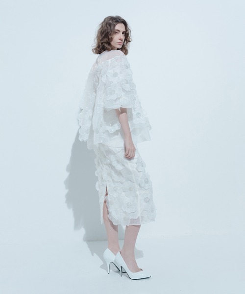 【LOULOU WILLOUGHBY 2026 Spring & Summer】 透け感と張り感のあるオーガンジーにし花柄の刺繍をし、さらに上から立体的な花びらとビジューのお花をのせています。ふわふわ、キラキラ、繊細な軽やかさとエアリーなボリュームを兼ね備えた特別な素材。素材を生かしたシンプルなタイトスカート。ボリュームのある素材でもスッキリと着用して頂けます。 《25ans WEB掲載アイテム》 【スタッフコメント】 ボリュームのある素材なのでタイトスカートでも体のラインを拾わないデザインです。 バックスリット入りで足捌きも◎ 〇着用感 重さ:軽い 透け感:ややあり 伸縮性:なし 裏地:あり ポケット:なし ※照明の関係により、実際よりも色味が違って見える場合がございます。 またパソコン・スマートフォンなどの環境により、製品と画像のカラーが異なる場合もございます。 予めご了承ください。