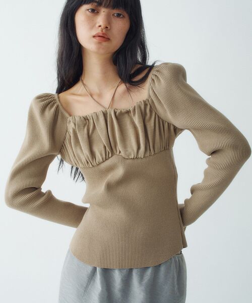 女性らしさと力強さを両立した、デザインニット。 【デザイン】 リブとギャザーのコントラストが絶妙な一枚で完成されたデザインニット。 肩のギャザーや袖口のスリット、切り替えられた胸元のラインが、フェミニンさを引き立てます。 華奢なリボンがさりげないアクセントとなり、どこか洗練された印象に。 【素材】 伸縮性が高く、体に心地よくフィット。 厚すぎず薄すぎない絶妙なバランスで、ロングシーズン着用可能です。 【スタイリング】 デニムなどカジュアルなアイテムと好相性。 身体に優しくフィットするので、インでもアウトでも着こなしやすいのが特徴。 デザイン性があるのでアクセサリーは控えめが◎。 ※製品寸法は平置きのスペックとなっております。こちらの商品は伸縮性があります。 ◆シリーズ femi rib knit dress(R99-54226) #デザインニット #ギャザー #フェミニン #リボン #リブ素材 【CODE A | コードエー】 FAV FASHION. FAV STYLE. 好きなファッションを自分らしく自由に楽しむすべての女性たちへ ※照明の関係により、実際よりも色味が違って見える場合があります。また、パソコン・スマートフォンなどの環境により、若干製品と画像のカラーが異なる場合もございます。 店舗へのお問い合わせ商品番号:R99-14227 ●製品寸法: 00(FREE):着丈53cm B70cm 裄丈83cm 備考: