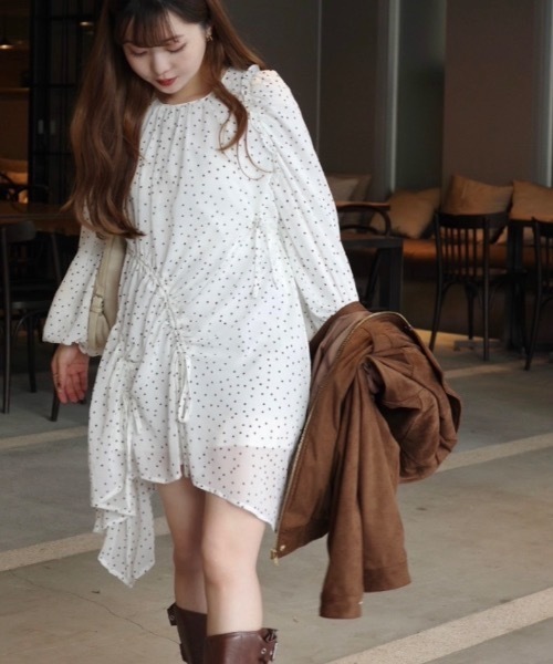 トレンドのドット柄素材を アシンメトリーな形に落とし込んだ チュニックが登場。 袖口まで裏地の付いたデザインで、 透け感がないのが魅力。 3か所のギャザーを絞って お好みの丈に調整が可能なデザインで、 ショート丈ボトムを合わせてミニワンピ風にも、 パンツやレギンスを合わせてトップスとしても 着回しが効くアイテム。 たぷっと溜まるお袖には ゴムが入っており、ストレスフリーな着心地です。