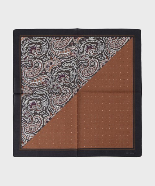 【デザインポイント】 ペイズリー・ドットとトラディショナルな柄を斜めに切り替えた遊び心あるデザインのプリントハンカチ。 柔らかいタッチでネッカチーフとしても使えるサイズ。 ※照明の関係により、実際よりも色味が違って見える場合があります。また、パソコン・スマートフォンなどの環境により、若干製品と画像のカラーが異なる場合もございます。 店舗へのお問い合わせ商品番号:070-04916 ●製品寸法: 00:H48cm W46cm 備考: