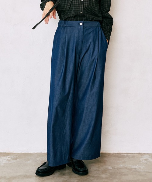 微起毛素材で仕立てたきれいめワイドデニムパンツ表面に微起毛を施した上品な表情のデニムパンツ。落ち感のある素材が叶える柔らかなシルエットは、穿き心地の良さも魅力です。ワイドすぎないバランスで、きれいめにもカジュアルにも対応できる万能アイテム。 フロントのディテールや後ろポケットのデザインなど、細部にまでこだわりを感じられる1本です。 コーディネート 【ブラウス】 フリルブラウスを合わせて、フェミニンさを取り入れたフレンチカジュアルに。【ブルゾン】ショート丈ブルゾンを羽織り、今年らしいバランスの効いた着こなしに。【ニット】シンプルなニット合わせで、素材感を引き立てたきれいめカジュアルに。※照明の関係により、屋外で撮影した写真の商品は、実際よりも色味が違って見える場合があります。またパソコン・スマートフォンなどの環境により、若干製品と画像のカラーが異なる場合もございます。予めご了承ください。実際の商品の色味は、スタジオ撮影の画像をご参照下さい。※商品画像はサンプルのため、色味やサイズ等の仕様に変更がある場合がございますので、予めご了承ください。アイテム詳細素材:ポリエステル70%,レーヨン25%,ポリウレタン5%サイズ: 【0】 ボトム丈:97.6cm,ウエスト:67cm,ベルト巾:4cm,わたり:36.5cm,ヒップ:109cm,股下:70cm,裾巾:31cm【1】 ボトム丈:100.1㎝,ウエスト:70cm,ベルト巾:4cm,わたり:37.5cm,ヒップ:112cm,股下:72cm,裾巾:32cm====================裏地:なし透け感:なし生地の伸び:なし光沢感:なしケア方法:手洗い可====================生産国:中国品番:12543001※取り扱い・ケア方法については、商品についている品質表示でご確認ください。