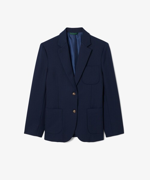 レトロカジュアルなムードを醸す3ポケットデザインのツイルブレザー・アニマルライツに配慮したウール×ポリエステルのツイル素材・ややゆとりを持たせたリラックスフィットの2ボタンジャケット・ブランド創業者ルネ・ラコステ着用モデルをオマージュした3つのパッチポケット・後ろ身頃にスプリット入り・左袖口にボディと同色のワニロゴパッチを配置・RELAXED FIT