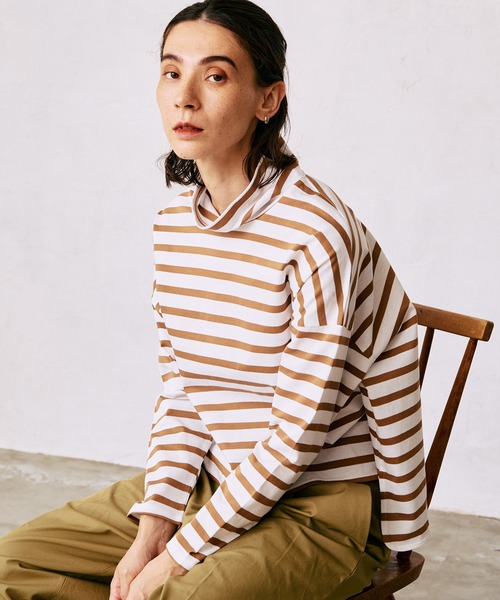 女性らしいオフタートルのバスクボーダープルオーバーマリンの定番、バスク天竺ボーダーを使用した今季の新作プルオーバー、この秋はデザインアイテムを2種類揃えました。オフタートルデザインが首元に柔らかな印象を与え、高すぎない襟丈で着こなしのアクセントに。 見頃はややワイドシルエット、今年らしいショート丈に仕上げ、ワイドパンツやスカートとの相性も抜群。カジュアルにもフェミニンにも楽しめる、長く愛用できる1枚です。コーディネート【ワイドパンツ】ショート丈のボーダープルオーバーをワイドパンツに合わせ、リラックス感のある上品カジュアルスタイルに。【スカート】フレアやタイトスカートと合わせて、女性らしいバランスを意識した着こなしに。【テーパードパンツ】シンプルなテーパードパンツと組み合わせ、ボーダー柄を主役にした洗練カジュアルコーデに。※照明の関係により、屋外で撮影した写真の商品は、実際よりも色味が違って見える場合があります。またパソコン・スマートフォンなどの環境により、若干製品と画像のカラーが異なる場合もございます。予めご了承ください。実際の商品の色味は、スタジオ撮影の画像をご参照下さい。※商品画像はサンプルのため、色味やサイズ等の仕様に変更がある場合がございますので、予めご了承ください。アイテム詳細素材:綿100%サイズ: 【F】 着丈:61cm,身巾:66cm,肩巾:65cm,天巾:23cm,衿巾:10cm,袖巾:19.8cm,袖丈:42.5cm,袖口巾:10cm,裾巾:66cm====================裏地:なし透け感:なし生地の伸び:あり光沢感:なしケア方法:手洗い可====================生産国:日本品番:12546001※取り扱い・ケア方法については、商品についている品質表示でご確認ください。