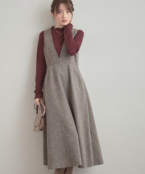 フィットアンドフレアシルエットのジャンスカです~POINT~深めのVラインと少し高めのウエスト切り替えがスタイルよく見えます◎バックにベロアリボンでレースアップしているので、肩紐が落ちにくくなっており、サイズ感の調整も可能です!【素材・機能】細いラメが織りこまれた暖かみのあるツイード素材です。【仕様】・ポケット数:横×2・左脇ファスナー・裏地あり※照明の関係により、実際よりも色味が違って見える場合があります。また、パソコン・スマートフォンなどの環境により、若干製品と画像のカラーが異なる場合もございます。【スタッフコメント】shino(164 )ツイード素材で上品に着ていただけるジャンスカです〇首元のVネックラインがすっきり見えにしてくれます。使いやすい2色展開で、インナーにカラーを合わせるなどのスタイリングもおすすめです!【25AW NEW ARRIVAL】【25AW NEW COLLECTION】モデル情報:身長163cm B81 W56 H82 着用サイズ:38(M)店舗へのお問い合わせ商品番号:508-54019●製品寸法:36(S):総丈118cm B84cm W72cm38(M):総丈120cm B87cm W75cm40(L):総丈123cm B90cm W78cm42(LL):総丈124cm B93cm W81cm備考: