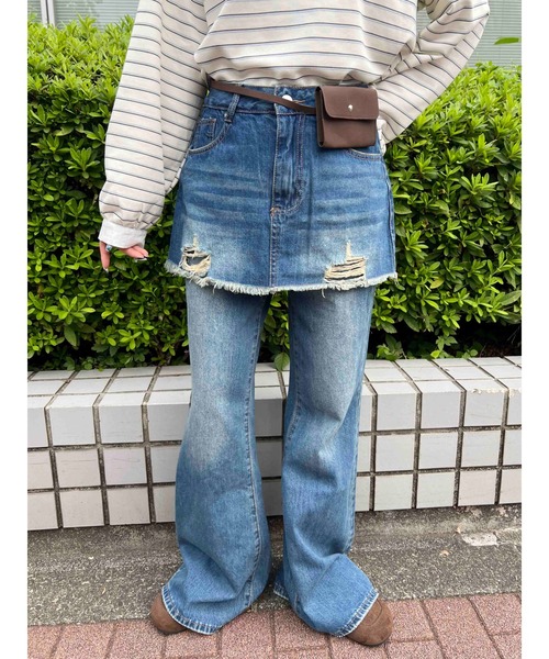 《注目アイテム》ドッキング風レイヤードデニムパンツミニスカートを重ねたようなドッキングデザインが目を惹く、トレンド感たっぷりの一本。カジュアルな中にモードなアクセントをプラスし、韓国ストリートな雰囲気を演出します。ダメージ加工×フレアシルエットで脚長効果も抜群!カットソーやスウェットを合わせてラフに着こなすのはもちろん、コンパクトなトップスを合わせてバランスよくまとめても◎1枚で存在感のある主役級アイテムです。▼便利なお気に入り登録▼商品のお気に入り登録で、再入荷の通知・ラスト1点・お得なセールの通知を受け取ることができます。ブランドのお気に入り登録で、新商品や再入荷など、さらにお得な通知を受け取れます。《Attention》・撮影はサンプル品を使用しており、実際の商品とは仕様や加工・サイズ等が若干異なる場合がございます。・撮影場所や照明の照射・角度、お使いのモニター環境により色味や仕様、加工、カラーが若干異なる場合がございます。・商品によっては1〜3cm程度の採寸誤差がある場合がございます。・移染等防止のため水や汗で濡れたまま放置することは避けて頂き、濃色アイテムは単体でのお洗濯をお願い致します。・素材臭がある場合は陰干しをお願いいたします。・アテンションタグを必ずご確認の上ご使用下さい。