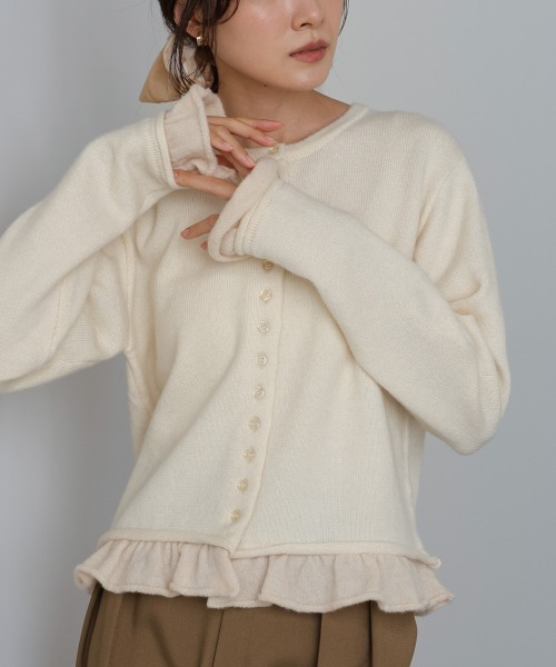 ●Bab● ■POINT 裾と袖にあしらった配色フリルが目を惹くニットカーディガン。可愛らしさの中にも上品さがあり、大人かわいいスタイルにぴったりの一枚です。フロントのボタンデザインがアクセントになり、羽織りとしてもトップスとしても活躍。柔らかなカラー配色で、カフェ巡りやお出かけにも映えるアイテムです。 ■FABRIC 軽やかであたたかみのある素材。ふんわりとした編地でやさしい肌あたりが特徴です。ニット特有のチクチク感が少なく、デイリーに快適に着用できます。 ■COORDINATE デニムやフレアスカートに合わせて、ほどよく甘めな大人カジュアルに。ワンピースの上にさらっと羽織るのもおすすめです。アイボリーはやわらかく上品に、グレーは落ち着いた印象に、ブルーは爽やかで華やかに。小物はベージュやホワイトトーンでまとめると、ニュアンス感のある大人かわいいスタイルが完成します! ………………… 透け感:なし 裏地:なし 洗濯:クリーニングネットをご使用ください 保管方法:型崩れ防止のためたたみの状態で保管してください ………………… ※撮影環境により、多少実際のカラーと異なる場合がございます。また、携帯やスマートフォン、パソコンなどの画面上と実物では多少色が異なって見える場合がございます。ご了承下さいませ。 ※画像の商品はサンプルのため、実際の商品と若干仕様が異なる場合がございます。 ※濃色品は、過度な摩擦や濡れた状態での摩擦により、色落ち・色移りをする恐れがあります。 ※この商品は、素材の特性上、洗濯の際に多少の伸びや縮みが生じる恐れがあります。洗濯後は形を整えてから干してください。 ※その他お取り扱いに関しましては、商品に付属のアテンションタグをご覧ください。 ★商品のお気に入り登録 再入荷やラスト1点のお知らせ、セール情報などお知らせを受け取ることができます! ★ブランドのお気に入り登録 新商品や再入荷などのお得な情報を受け取ることができますので、是非ご登録ください。 ★Bab公式Instagramアカウント【bab.showroom】で最新情報をチェック!