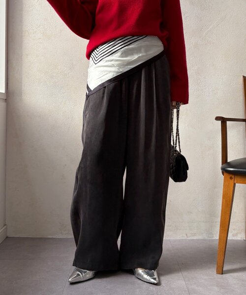 ■2025 AUTUMN & WINTER ITEM■とろみ素材でイージーながらも品の良さをアピール!再生繊維(セルロース)とレーヨンをブレンドした上品な微光沢と、とろみのあるドレープ感が魅力のワイドパンツ。素材にフィブリル加工を施すことで、表面に微細な起毛感と柔らかなタッチが生まれ、抜け感のでる表情に仕上がっています。ウエストは総ゴム仕様+紐付きのイージーデザイン。ストレスフリーな穿き心地ながら、素材の持つ落ち感と美しいワイドシルエットで、リラックス感と品の良さを両立しています。シンプルなニットやスウェットを合わせるだけで、大人の抜け感あるスタイリングが完成。幅広いシーンで活躍する一本です。- POINT -・とろみのあるドレープ感が魅力・ウエストは総ゴム仕様・幅広いシーンで活躍!--------------------------------洗濯:水洗い不可能透け感: ほとんどなし裏地: なし伸縮性: ややあり光沢感: ややあり--------------------------------【 ♡をクリックでお得な情報をお知らせいたします 】〈 商品のお気に入り登録 〉 お気に入りアイテムのお値下げ・再入荷・在庫ラスト1点など通知を受けることができます。〈 ブランドのお気に入り登録 〉DOUDOUの新商品や再入荷、セール、クーポン配布などお得な情報を受けることができます。--------------------------------------※ 生産の都合上、お届け時期が前後する場合がございます。※ 掲載画像の商品の色味は、 撮影場所や光の当たり具合などにより色味が異なって見える場合がございます。 また、お客様のお使いのPC・スマートフォン等のモニター環境などにより色味が異なって見える場合がございます。予めご了承の上ご注文ください。 ※ 着用、お取り扱いの際は、商品についている品質表示とアテンションタグを必ずご確認下さい。