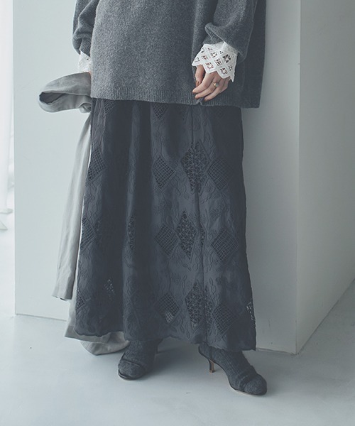 刺繍とカットワークの豪華なデザイン 華やかな印象のレーススカート ーーー 【素材】 カットワーク刺繍生地を使用。 生地全体に刺繍とカットワークが入り華やかな印象です。 【デザイン】 コーデの主役にぴったりなロング丈のレーススカート。 華やかな印象なので、暗くなりがちな秋冬のコーデを明るく見せてくれます。 裾がスカラップになっているところもさりげないデザインポイントです。 ーーー 【スタイリング】 スカートを主役に、ニットやスウェットなどオーバーサイズのトップスを合わせていただくのがおすすめ◎ ワンピースの下にレイヤードして裾からのぞかせるスタイリングも素敵です。