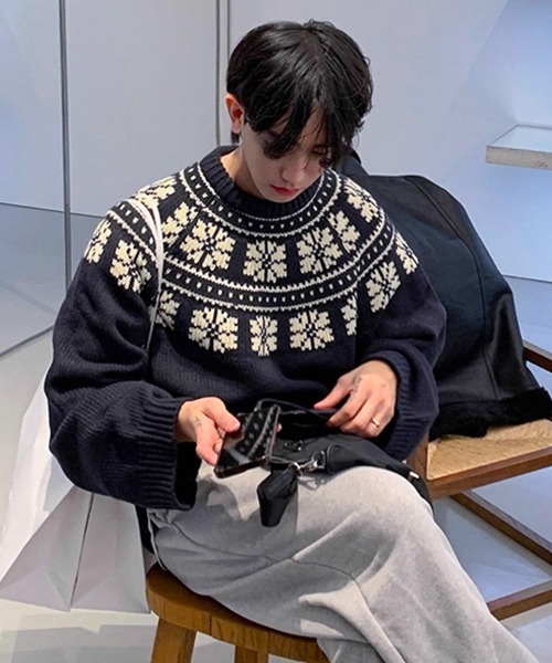 【NOWLE】ウィンター レトロ ノルディック柄 プルオーバー ニット■ 暖かみのある雪柄が彩る、ウィンタークラシックこのウィンター レトロ ノルディック柄 プルオーバー ニットは、雪の結晶や幾何学模様をモチーフにした伝統的なデザインが魅力です。首元から肩にかけて円形に広がるヨーク部分のジャガード編みが、顔周りを華やかに、そして暖かみのある印象に見せてくれます。寒い季節にぴったりなこのクラシカルな柄は、一枚着るだけで冬の装いを特別なものにしてくれる主役級のアイテムです。■ どこか懐かしいレトロな配色と着心地柄に使われているのは、ネイビーとホワイトといった、どこか懐かしいレトロな配色です。この配色が、ノスタルジックでありながらも現代のファッションに自然と溶け込むヴィンテージライクなムードを生み出します。ふっくらとした編地は保温性に優れており、北欧の厳しい寒さに耐えるために生まれた柄のルーツを感じさせる確かな暖かさです。ゆったりとしたプルオーバータイプで、重ね着がしやすいリラックスした着心地も特徴です。■ デイリーコーデに差をつける北欧風デザインカジュアルなデニムやチノパンにはもちろん、きれいめなスラックスやロングスカートと合わせることで、柄の存在感が際立ち、コーディネートに差がつきます。アウターから柄をのぞかせるだけで、冬のマンネリしがちなスタイルに新鮮なアクセントを加えられます。この一着で、心温まる北欧の冬の雰囲気を日常に取り入れてみてください。■ トレンド感あるジェンダーレスな着こなしを提案このノルディック柄ニットは、程よいゆとりを持たせたリラックスシルエットで、性別や年齢を問わず着用いただけるジェンダーレスデザインです。メンズはシャツやタートルネックとのレイヤードでトラッドな雰囲気に、レディースはざっくりとワンピース風に着こなしたり、ハイウエストのボトムにタックインしたりしてトレンド感あるスタイルが楽しめます。大切な人とのペアルックや、色違いでの着用もおすすめです。【NOWLE(ノウル)】now+owlの造語で幸福の鳥owl(フクロウ)をモチーフにしたブランド名"今"と"幸福"を大切にという想いを込めて立ち上げたセレクトブランドです。【NOWLEの新着情報について】▼商品のお気に入り登録完売カラーの再入荷通知や、ラスト1点の通知、セールの通知も受け取ることができます。▼ブランドのお気に入り登録新商品や再入荷等、いち早く"NOWLE"のお得な情報を受け取ることができます。※こちらの商品の画像はサンプルを使用しているため、一部製品と仕様が異なる場合がございます。ご覧のモニター環境や撮影環境により実際の商品と多少色味が異なって見える場合がございます。この点をご了承の上、お買い求めください。ご理解の程よろしくお願いいたします。ポイント!ニット セーター プルオーバー ノルディック柄 フェアアイル柄 雪柄 ジャガード編み ヨークニット 求心柄 北欧風 レトロ ヴィンテージ クラシック トラッド ざっくり編み 暖かい 防寒 リラックス ルーズ ユニセックス ジェンダーレス メンズ レディース 秋冬 トナカイモチーフ ジオメトリック柄CZ_0008