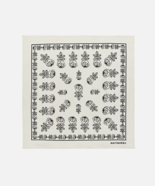 『Marimekko Kioski』 マリメッコのアイコン的プリントを再解釈し、無限のワードローブを提案するジェンダーニュートラルなストリートウェア Marimekko Kioski(マリメッコ キオスキ)。「他人の真似はせず、自分らしく」をキーワードに、作り物ではないオーセンティックなスタイルを追求したコレクション。【テキスタイルデザイン:Maija Isola(マイヤ・イソラ)】 Vihkiruusu(ヴィヒキルース):ウェディングローズ華やかでいてクールなバラ柄のスカーフ。首元に巻くのはもちろん、バッグのチャーム代わりにしても可愛い。さらりとしたコットン素材で、オールシーズン快適にご使用できます。※商品ひとつずつの柄の出かたが異なるため、表示画像のディテールと多少異なるデザインのものが届く場合がございます。予めご了承ください。