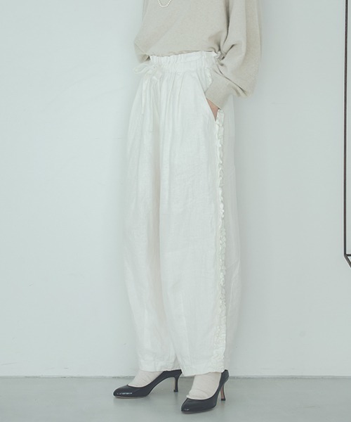 夏に人気だったアイテムが新色を加えて今季も登場!脇フリルが特徴的なパンツーーー【素材】定番のリネンツイル素材を使用。程よいハリ感と柔らかさが特徴です。【デザイン】夏に人気だったサイドフリルパンツが、新色を加えて今季も登場!脇のフリルが目をひく一着で、ストライプ柄は脇フリルを無地にすることでデザインポイントに。ウエストはイージーなゴム仕様になっており、紐も付いているので調節可能◎裾が少しコクーンになったシルエットもポイントです。ーーー【スタイリング】パンツをメインに、ニットやカットソー、ブラウスなどを合わせていただくのがおすすめ。ワンピースやチュニックのレイヤードパンツとして、フリルをポイントに合わせていただくのも素敵です。