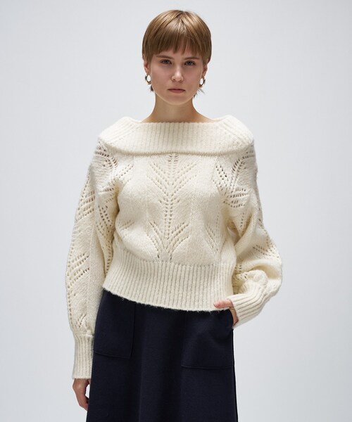 【デザイン】・シーズンムードを高める、大人フェミニンな印象のニット。・細やかな透かし編み柄が目を惹き、シンプルなスタイリングにも存在感をプラス。・広めのボートネックデザインで、ワンショルダーやオフショルダーとしても着用可能。・たっぷりとした袖と、コンパクトな着丈がバランスの取れたシルエット。【素材】・ふんわりとした軽さと柔らかな肌触り。・程よい厚みがありながらも軽やかに着られる素材感です。【着こなしポイント】・短めの丈感で、ウエストアウトでもボトムを選ばず、バランスよく決まるデザイン。・スカート合わせでフェミニンにまとめるのはもちろん、デニムでカジュアルダウンすれば抜け感のある大人スタイルに。モデル身長:174cmーーーーーーーーーーーーーーーーーー気になるアイテムはお気に入り登録がおすすめ!お気に入り登録で、再入荷通知やお値下げ情報をお知らせ。お得な情報をいち早くお届けいたします!アイテムページにある、ハートマークをクリックして追加できます。ーーーーーーーーーーーーーーーーーー※照明の関係により、実際よりも色味が違って見える場合があります。また、パソコン・スマートフォンなどの環境により、若干製品と画像のカラーが異なる場合もございます。店舗へのお問い合わせ商品番号:R91-14409●製品寸法:02(M):着丈48cm B100cm 袖丈50cm 肩幅46cm備考: