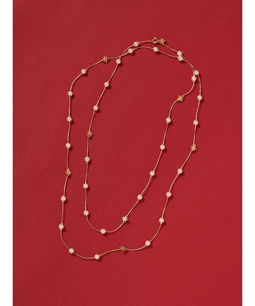 【パールビジューと星型モチーフがエレガントなアレンジ自在のY字ネックレスで華やかに】【Design/Styling】シックで繊細なツイストチェーンに、レジンパールと、星型モチーフを等間隔に配置した、アレンジ自在なY字ネックレスが届きました。星型モチーフには小粒のビジューをあしらって煌めきをプラス。ロングチェーンタイプで、留め金の位置を変えて、Y字にしたり、2連にしたり、スタイリングに合わせて自由に長さやアレンジを変えてお楽しみいただけます。Y字は、後ろに垂らしても可愛いです。シルバーとゴールドの2色展開です。※照明の関係により、実際よりも色味が違って見える場合があります。またパソコン・スマートフォンなどの環境により、若干製品と画像のカラーが異なる場合もございます。予めご了承ください。商品の色味は、商品単品画像をご参照下さい。 ※商品画像はサンプルのため、色味やサイズ等の仕様に変更がある場合がございますので、予めご了承ください。