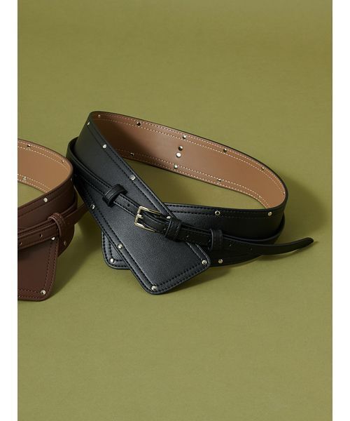 【スタッズ付きのベースを外せば細ベルトとしても使える本革2WAYベルト】【Design/Styling】本革を使用した、高級感のある2WAYベルトがお目見え。エッジを効かせたアイテムで、ワンピースなどのウエストマークにも便利なアイテムです。等間隔で施されたシルバースタッズが程よい輝きをプラス。このスタッズを施したベース部分を外せば、コンパクトなシルバーバッグルが施された細ベルトとしても使用できる便利な2wayデザイン。ミニスカートやパンツスタイルに合わせたり、さまざまなスタイリングに活躍します。ブラックとブラウンの2色展開です。チェックアシメネルシャツワンピース(SWFO255053)と合わせたコーディネートもおすすめです。※照明の関係により、実際よりも色味が違って見える場合があります。またパソコン・スマートフォンなどの環境により、若干製品と画像のカラーが異なる場合もございます。予めご了承ください。商品の色味は、商品単品画像をご参照下さい。 ※商品画像はサンプルのため、色味やサイズ等の仕様に変更がある場合がございますので、予めご了承ください。