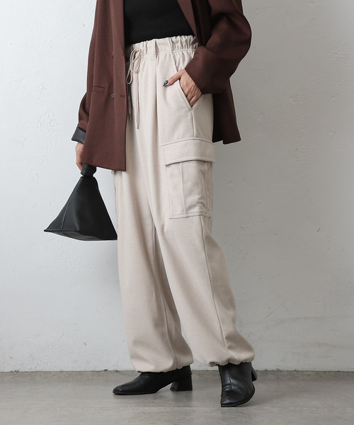 【機能性抜群のウールライクカーゴパンツ】ウールライクな素材感を使ったジャージカーゴパンツです。裾にはドローコード付きなのでお好きなシルエットに調整可能なのもポイントです。また、ウエストは総ゴム+ドローコード付きでストレスフリー◎両サイドにポケットや、ベルトループなど機能性も充実しているアイテムです。キレイめにもカジュアルにも合わせやすいアイテムです。【商品ポイント】・キレイめにもカジュアルにも◎・ウエストは総ゴム+ドローコード・裾にはドローコードがあるのでシルエット変更可能----------------------------------------------------■商品特徴洗 濯 方 法 :洗濯機洗い可(弱)裏 地 :なし透 け 感 :な伸 縮 性 :なし光 沢 感 :うあうああり生地の厚さ:普通----------------------------------------------------■素材ポリエステル88%, レーヨン12%----------------------------------------------------※着用、お取り扱いの際は、商品についている品質表示とアテンションタグを必ずご確認下さい。※商品タグに記載されている商品名がWEBでの表記名と異なる場合があります。※実際の商品と仕様、加工、サイズが若干異なる場合がございます。※照明の関係により、実際よりもやや明るく見える場合がございます。またパソコンなどの環境により、若干製品と画像のカラーが異なる場合もございます。予めご了承くださいませ。【お気に入り登録】してお得な情報をCHECK!!・「商品のお気に入り登録」で再入荷通知や、ラストの通知、セール通知も受け取ることができます。・「ブランドのお気に入り登録」で新商品や再入荷など、お得な情報を受け取ることができます。