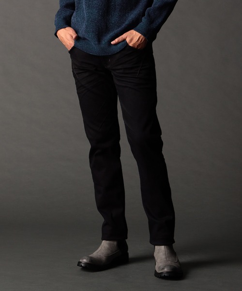■デザインアクセントに前ポケット脇から膝に向けてダーツを入れたデザイン5ポケットパンツ。素材のストレッチ性にあわせてウエストベルトも伸びる様に縫製、別布もストレッチ裏地を使用していますので穿き着心地も抜群です。革ネームやオリジナルのボタン、Dカンを使用、腰裏の刺繍や後パッチポケットのオリジナル切り替えデザインを特徴にしています。ヴィンテージデニムの様に裏側のステッチを配色にしたりして手の込んだ縫製で仕上げています。■加工67ネイビーは、インディゴデニムをベースに全体的にユーズド加工を施してから、3Dシワ加工と顔料吹き付け加工を入れています。91その他2は、インディゴデニムをベースにワンウォッシュ程度の洗い加工をしてから、3Dシワ加工と顔料吹き付け加工を施しています。92その他3は、黒の硫化染めしたコーデュロイ素材で、ブラストと削りを少し強めに入れて当たり感を出し、3Dシワ加工と顔料吹き付け加工を施しています。■サイズ膝から裾口にかけて少しゆとりを出した程良いスリムストレートシルエットの細身の綺麗なラインです。股下はフルレングスなので裾上げして調整して下さい。■素材67ネイビー/91その他2は、「バルキィーウォーム」と言う蓄熱効果のある13オンス程のストレッチインディゴデニム。天然成分の溶岩岩を1ミクロン以下に粉砕してポリエステルの糸に練り込み、生地にしています。赤外線を吸収して発熱・蓄熱効果と抗菌効果があり、テンションのあるストレッチ性が特徴です。92その他3は、色落ちをする特殊な硫化染料で染めたカルゼ織りのガムストレッチコーデュロイ。ハイテンションのストレッチ性と、綾目の織柄が際立っていますので、経畝のコーデュロイとは差別化を図ります。伸縮性:あり生地の厚さ:普通裏地:なし■注意点・67ネイビー/91その他2、最終加工で移染防止剤にて色落ちを抑える様にしていますが、インディゴ染色素材なので絶対色落ちしない事はありません。段々色あせてくるのが染色上、デニムの特性、味になります。92その他3も同様、硫化染め素材になりますので、着用や洗濯方法によって色がデニムの様にあせてきます。素材の特性にご注意ください。変色しやすいので、強い光には当てない、当たらない様に取り扱いにもご注意ください。※画像の商品はサンプルです。実際の商品とは仕様・加工・サイズ・素材が若干異なる場合がございます。※ 掲載画像の商品の色味は、撮影場所や光の当たり具合などにより色味が異なって見える場合がございます。商品の色味は、生地アップの画像をご参照ください。また、お客様のお使いのPC・スマートフォン等のモニター環境などにより色味が異なって見える場合がございます。予めご了承の上ご注文ください。