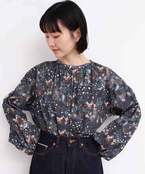 澄んだ空にきらきら光る星と、オーロラが広がる冬の森。山並みの中には小さなおうちが並び、とびまわる雪うさぎも住んでいる。絵の具で重ねて、ぼかしてを繰り返して描いた森の景色に、切り絵でつくった星をのせてつくった柄です。ベージュは空が白くて薄暗い、冬の昼間のような雰囲気で甘すぎない淡い色合い。ネイビーは冬の街に明かりがともったようなあたたかな雰囲気。寒い冬だけの景色や空をとじこめました。薄手のシャツコールにプリントをし、ほどよい厚みとあたたかさ。冬の中着に活躍するブラウス。タートルなどをインするのもおすすめです。※着用商品はサンプルです。実際の商品と仕様、加工、サイズが若干異なる場合がございます。サンプルからの変更点:柄のサイズが少し(30%)大きくなります。《ネイビー》の色味が全体的に少し深くなり柄がくっきりするよう修正します。正しくは最後の参考画像をご参照ください。※光の関係で実物の商品の色味とは若干異なる場合がございます。実際に近い色味は詳細画像をご参照下さい。※取り扱いの注意については取り扱い表示をよくご確認の上、着用をお願いいたします。【素材の特性、お取り扱いの注意】・この製品は、インクジェットプリントを施しております。汗や雨等でぬれた時や強くこすられた場合に色落ちし、他の衣料、小物に移染する事があります。白及び淡色の衣類、バッグ等をご使用されますと、色移りする事がありますのでご注意下さい。洗濯の際は他の物に色がつく場合がありますので単独で洗って下さい。・この製品はコーデュロイの生地を使用しております。ほこりが付きやすいのと、布目が寝てしまう(アタリが出てしまう)性質がありますのでブラシなどでのお手入れが必要です。アイロンがけは極力おやめください。毛が抜けやすいので粘着テープの使用はお避けください。また、湿った状態で放置したり、他のものと擦れたりすると色移りの可能性があります。水に濡れると強度が落ち、縮む可能性があります。・この製品の生地は大変デリケートな素材のため、強度の力が加わると、裂ける場合があります。お取り扱いには十分注意して下さい。・独特の風合いを出すため製品洗いをしてます。一枚一枚の色味、風合い、サイズ等も微妙に違います。素材の特性上、しわが出来やすいのですが、他の製品では味わえない雰囲気をお楽しみください。・この製品を洗濯する際には多少縮む場合がありますので、形を整えてから日陰で干して下さい。l'atelier du savon(アトリエドゥサボン) CONCEPT 1つ1つにかけられた手のぬくもり日々の生活に、少しのデザインを加えた大人の日常着あそび心とあたたかみ
