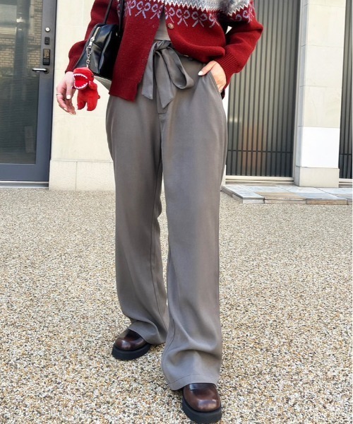 「脚長見えが叶う、ゆるっとフレア。」裾に向かってほんのり広がるフレアシルエットが、自然と脚をすっきり見せてくれるスラックスパンツ。配色ステッチが効いていて、シンプルすぎずおしゃれ感もしっかり◎共地のリボンが付いているから、ウエストマークしてコーデのアクセントにしても可愛いし、外してシンプルにまとめてもOK!気分やシーンでアレンジが楽しめるのもポイントです。カジュアルなTシャツ合わせはもちろん、ブラウスやジャケットと合わせれば大人っぽい雰囲気にも。「着回し力が高い=困ったときに頼れる1本」になること間違いなし!■ポイント・ミニレックス・恐竜界隈・ダブルネーム・DOUBLE NAME■素材・伸縮性:なし・透け感:なし・光沢感:なし※生地寄りの画像が実際の色味と近いものとなります。※ご覧のモニター環境や撮影環境により実際のカラーと異なる場合がございますので画像をご参照の上、ご了承頂けますようお願い致します。