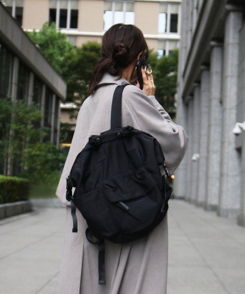 ナイロン素材の2WAYバッグ。リュックとしてはもちろんですが、トートバッグとしてもご使用いただけます。サイドの留め具を外すと更に大容量になるので、お荷物が増えた時にも便利。背面のポケットは長財布、前面・サイドのポケットにはペットボトルが入るくらいの収納力です。内側にもポケット付きがあるので、小物の整理にも重宝します。デイリー使いはもちろん、お仕事、旅行にもおすすめの2WAYバッグです。