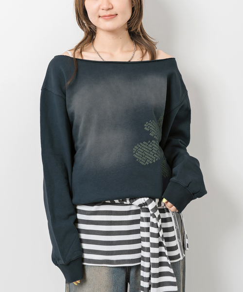 ヴィンテージ感と遊び心を効かせたワンショルプルオーバー。25SSで人気だったワンショルダーを、新しいグラフィックでリモデル。プリント後に日焼け加工を施し、こなれたヴィンテージ風の仕上がりに。衿ぐりのカットオフデザインはそのままに、キャミソールやタンクトップをレイヤードして、ワンショル部分からインナーを覗かせるスタイリングもおすすめ。ボートネック風にも着られるアレンジ力で、オフショルながら着丈はたっぷりめ、ヘルシーな肌見せを叶えます。裾のリブを強めにして、すっきりとしたシルエットに。グラフィックには「u always f**king worry about your reputation, don't you?」というSNS世代に響く皮肉なメッセージを繰り返し配置し、花柄モチーフに。さらに、よく見ると文字の中にひとつだけハートが隠れている遊び心もポイント。※取り扱いについては、商品についている品質表示にてご確認下さい。※照明の関係により、実際よりも色味が違って見える場合があります。またパソコン・スマートフォンなどの環境により、若干製品と画像のカラーが異なる場合もございます。※商品の色味は、商品アップ画像をご参照ください。モデルサイズ:身長:163cm 着用サイズ:フリー本体:手洗い可能