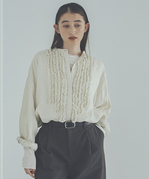 女性らしいフリルデザインがポイント一枚でもサマになるリネンブラウスーーー【素材】程よい厚みのリネン素材を使用。落ち感としなやかさも特徴です。【デザイン】アンティークな雰囲気のリネン素材のブラウス。フロントのフリルがデザインポイントで、一枚でもサマになる主役級のアイテムです。ゆったりとしたサイズ感とたっぽりとしたお袖もポイント◎一枚着としてはもちろん、インナーとしてもご着用いただけます。ーーー【スタイリング】パンツ合わせの大人カジュアルな着こなしや、ハーフパンツに合わせたトラッドスタイルもおすすめ。ジャンスカやVネックサロペットのインに合わせたり、カーディガンのインナーとしても◎