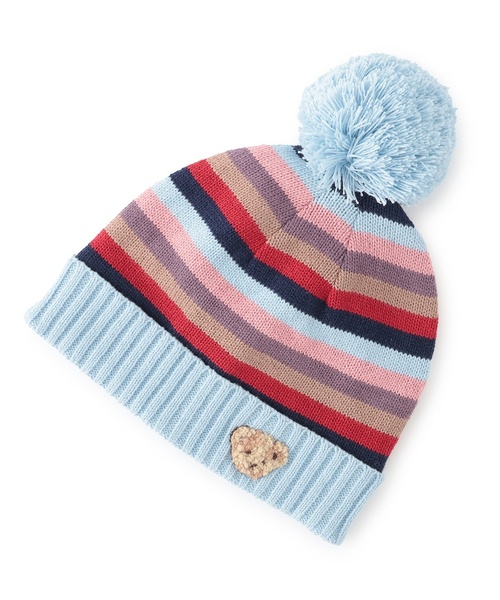 カラフルな配色が目を引くボーダー柄のニット帽です。 てっぺんの大きなポンポンと、愛らしいクマちゃんの刺しゅうがポイント。 かぶり口はリブ編みになっており、お子さまの頭にやさしくフィットします。 寒い季節の防寒対策にも役立つアイテムです。