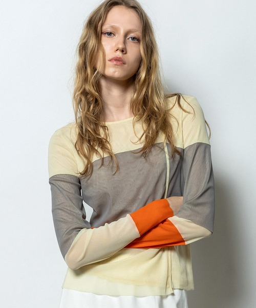 パワーネットチュールの2枚重ねのインナーで、 身頃はベアトップのように配色になっているデザイン。 袖も同じ横位置と配色で、6分丈でふらされている。袖口は、 カラーブロックに切り替えになっており、スタイリングの配色ポインと になるインナー。透け過ぎないシアー感も着やすい。左デコルテは、 少しだけ肌見せ開きデザインが、春らしいディテール。 パワーネットチュールは伸縮性があり動き易く、薄いので肌馴染みも良い。 ※生産の都合上、商品の納期が変更となる場合がございます。 ※商品の画像はサンプルのため、実際の製品とは仕様や加工、 サイズ等が若干異なる場合がございます。