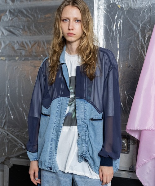 アローポケットがポイントのデニムコンビブルゾン。 デニム身頃にサテン配色パイピングのアローポケットは、 ヴィンテージな雰囲気でデザインのポイントに。上身頃と袖は、 夏でも着れるように涼し気なシフォンを使用。サイズは全体にオーバーサイスで、 裾と前立ては、ドロスト仕様でギャザーをよせて、 ボリューミーなシルエット変化も楽しめる。後ろ身頃は、 配色ステッチやロゴ刺繍が入り、中央は異素材のシアーメッシュがコンビネーション された他にはないデザイン。裏無しで、とても軽量な春夏に活躍するブルゾン。 ※生産の都合上、商品の納期が変更となる場合がございます。 ※商品の画像はサンプルのため、実際の製品とは仕様や加工、 サイズ等が若干異なる場合がございます。