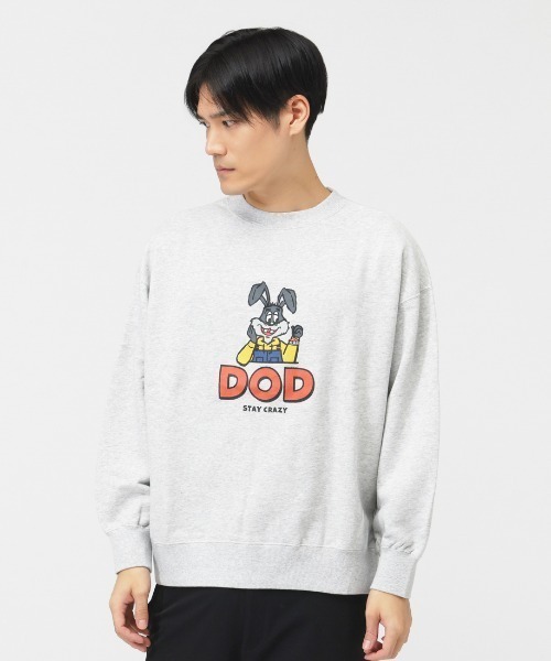 ●DODカレッジうさぎのクラックプリントデザイン ●イージーケアな綿100%素材 ●汗をかいてもさらっと着られる裏毛素材 ●背面の首元にはロゴプリント
