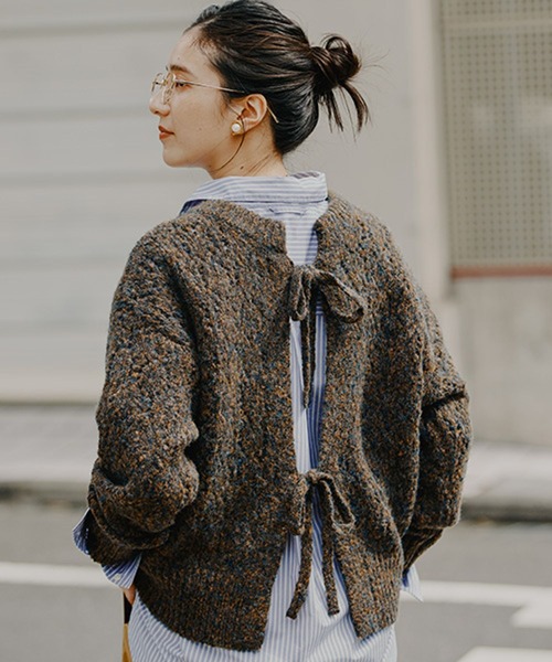 コーデの幅が広がる2WAY仕様大人可愛いリボンがポイントのニットカーディガンーーー【素材】ブークレの表面感とMIXカラーが印象的な素材を使用。膨らみのある素材感も特徴です。【デザイン】5ゲージで作成されたダブルフロント仕様のニットカーディガン。嬉しい前後2WAY仕様で、バックのリボンがデザインポイントです。暖かみのある冬素材に透かし柄の編地が新鮮な一枚。トップス ニット ニットカーデ カーディガン カーデ リボンーーー【スタイリング】キャミソールやタンクトップと合わせたヘルシーな着こなしや、薄手のカットソーを合わせて袖口からちらっとのぞかせた着こなしが◎リボン側を前にして、ワンピースやスカートスタイルに羽織る着こなしもおすすめです。