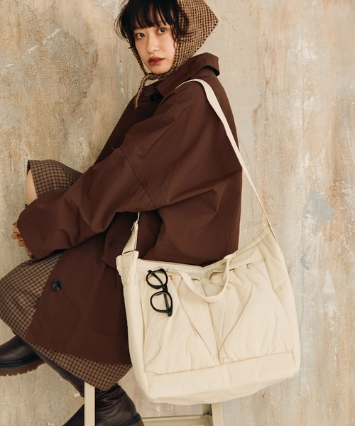 【大きなアウトポケットデザインがポイントの大容量ショルダーバッグ】・中綿のボリューム感と丸みのあるフォルムが柔らかい印象に・アウトポケットに加え内ポケットもついており、マチもたっぷりある大容量バッグ・手持ちはもちろん、ショルダーバッグとしても使用可能・キャリーオンベルトが背面に付いているので、旅行時にはキャリーバッグに引っ掛けて使っても○~スタイリング~軽量で持ち運びしやすいので、アクティブなシーンにも使いやすい1点。通勤・通学などの荷物が多い場面でも安心の大容量◎コーディネートを選ばすに使えるのでデイリー使いにぴったりです。※着用、お取り扱いの際は、商品についている品質表示とアテンションタグを必ずご確認下さい。秋冬/大容量/ナチュラル