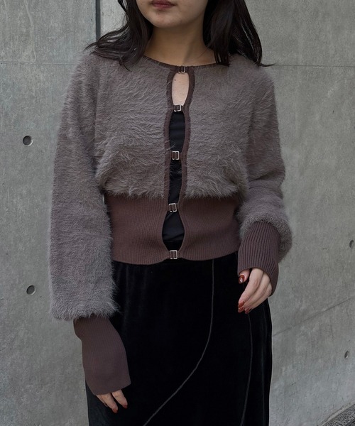 配色がポイントの、秋冬らしいシャギーカーディガン【Point/Styling】短めのシャギー素材をたっぷりと使用し、上品さの中にトレンド感を取り入れたデザイン。フロントにはシルバーホックをあしらい、&g’aimeらしいモードな雰囲気を演出します。短めの着丈と、幅をもたせた裾のリブでウエストラインを自然にマークし、スタイルアップ効果も◎ボリュームのあるシルエットながら、クルーネックが首元をすっきりと見せてくれます。程よい衿ぐりやリブの長さなど、細部までこだわりの詰まった一枚。前を閉じてトップス風に、開けて羽織りとしても着られる2WAY仕様。一番下のホックを外して抜け感をプラスしたスタイリングもおすすめです。ワイドパンツやタイトスカートはもちろん、ワンピースの上からも好相性です----------------------------------------------------【Detail】・柔らかな編地を使用・程よいフィット感でスタイルアップ効果・ウール混素材ではないため、チクチク感がなく快適に着用可能透け感/なし光沢感/なし伸縮性/あり厚 み/普通----------------------------------------------------※撮影場所により、実際の色味と若干異なる場合がございます。またパソコン・スマートフォンなどの環境により、若干製品と画像のカラーが異なる場合もございます。予めご了承ください。※商品画像はサンプルのため、色味やサイズ等の仕様に変更がある場合がございますので、予めご了承ください。----------------------------------------------------【お買い物を楽しんで頂く為に】■商品のお気に入り登録お気に入りの登録をして頂きますと完売カラーの再入荷通知や、ラスト1点の通知を受け取ることができます。■ブランドのお気に入り登録新商品の発売や再入荷、タイムセールやクーポン発行のお知らせなど&g'aimeがお届けするお得な情報を受け取ることができます。