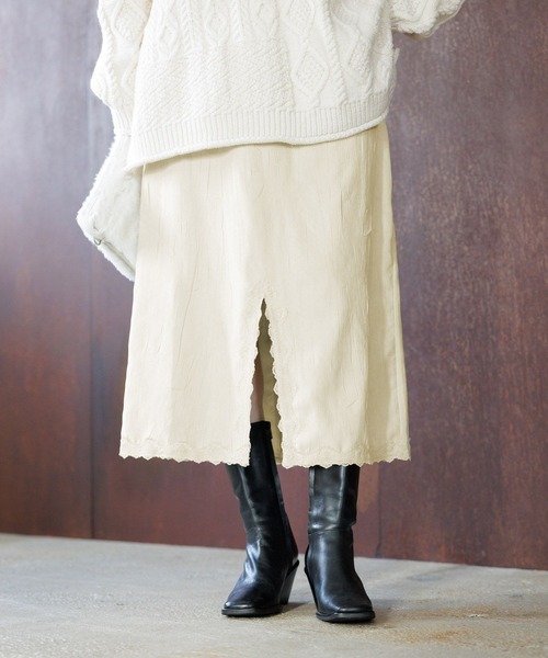 いろいろな着こなしが楽しめる万能アイテムパンツとのレイヤードにもおすすめなナロースカートーーー【素材】スエードライクな微起毛でシワ加工の入った素材を使用。裾スリットには華やかなレースを施しています。【デザイン】大人なカラーリングで女性らしいナロースカート。秋冬ならではのボリューム感のあるトップス合わせに使える万能アイテムです。丈感はあえて少し短めに設定しているので、パンツとのレイヤードもお楽しみいただけます。ボトム スカート ストレート スウェードーーー【スタイリング】ニットやスウェットなどボリューム感のあるトップス合わせがおすすめ。やや短め丈なので、デニムなどのカジュアルなパンツ合わせもバランスよく着こなせます。