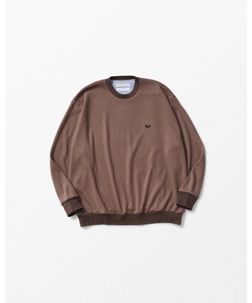 ■ワインポイント刺しゅうのクルーネックニットソー。アクリルとウールの混紡糸を使用した、程よいボリューム感と上品な質感が特徴のスムース素材を使用しています。左胸にワンポイント刺しゅう。リブ部分にはコットン素材を使用することで、スウェットのような風合いを演出しています。