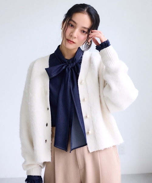 【2025 Autumn/Winter】【25AW】<POINT>・ふわふわシャギー・パールボタンでポイント・袖に丸みがあって身頃はすっきりめ・バランスのとりやすい着丈感・グレー×ホワイトのチェックアソート【デザイン・シルエット】ふわふわシャギーの素材がかわいくてパールボタンがポンとのVネックカーディガン!袖に丸みがあってぽわんとしていて女の子らしいです。その代わり身頃は比較的すっきりめにしました。合わせやすい着丈感に設定しています。【素材】手洗い可能なシャギー素材。【カラー】グレー(チェック柄)、オフホワイト、ネイビーの3色展開。【おすすめのスタイリング】同素材のニットスカート(品番:BVC45130)とのセットアップはかわいくておすすめです!単品でも着やすいカーディガンはワイドパンツとの相性も抜群!深すぎないVネックなので1枚で着てもいいですし、中にレースやTシャツを合わせてもかわいいです。-----------------------------裏地:なし光沢感:なし透け感:オフホワイト(15)ややあり伸縮性:ありポケット:なしボタン:あり(開閉可)生地の厚さ:やや厚手季節:秋、冬-----------------------------【モデル着用サイズ】身長:168cm 着用サイズ:F※画像の商品はサンプルです。 実際の商品と仕様、加工、サイズが若干異なる場合がございます。※画像によっては実際の色味と異なる場合があります。正しい色味は生地アップ画像をご確認ください。