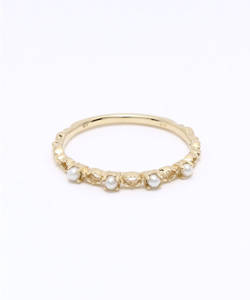 繊細な透かし模様とフェミニンな極小パールが連なった、レースの「はかない白さ」をイメージしたパールアイテム。 プチサイズのパールのこっくりした存在感や高級感が感じられるよう、パールとパールをあえて離して配し、パールのアウトラインを浮き立たせたり、爪で包み込むように留めたりと細部にこだわっています。 透かし部分には、玉やリーフ調のレリーフを並べ、光の動きがでるデザインに。パールの高さとの高低差もあいまって、指にそうように美しい輝きのグラデーションを描いています。 *サイズ直し可能(±2サイズ) *天然石、パール、珊瑚などの素材が含まれている商品は多少の個体差がある場合がございます。あらかじめ、ご了承くださいませ。