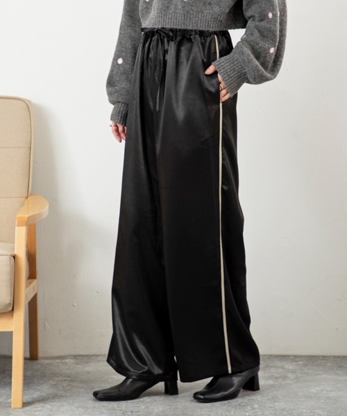 【艶めきサテンで細見えリラックス】落ち感のあるストレートシルエットが体型カバーを叶えつつ、大人カジュアルな抜け感を演出。サイドラインがさりげなくスポーティーで、休日もお出かけも気分を上げてくれる万能パンツ。