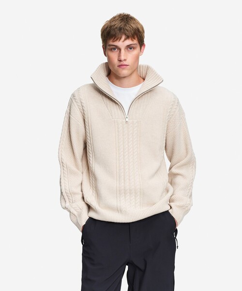 ジップアップハイカラーとグラフィックなタッチを加えるツイストパターンが特徴の、カジュアルルックのオーバーサイズセーター。・ルーズフィット ・ハイネック、ハーフジップ前面 ・長袖 ・ケーブルニット ・背面に同系色のバードロゴパッチを編み込み