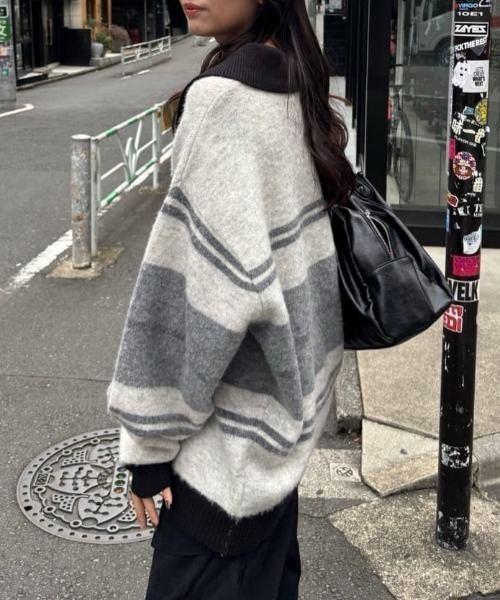 ゆるっと着こなす、大人カジュアルなジップニット■デザインゆるっとした抜け感が可愛いボーダージップニット。ハーフジップデザインで襟元の開き具合を調整でき、一枚での着用はもちろん、インナーとのレイヤードも楽しめます。オーバーサイズシルエットがこなれた雰囲気を演出し、デイリーに活躍する万能アイテムです。■生地感ふんわりとしたタッチのモヘアライクニット素材。軽く柔らかい着心地で、見た目にもあたたかみのある質感です。ほどよい厚みで、秋冬のメイントップスとしても重ね着にもぴったり。■コーディネートミニボトム合わせでトレンドのバランスに。デニムやワイドパンツでカジュアルに。スカートやブーツを合わせてフェミカジュにも◎。ジップを開けて抜け感を出すとこなれた印象に仕上がります。■素材・洗濯表示素材:ブラウン・グレー:【本体】アクリル 47%,ポリエステル 45%,毛 5%,ポリウレタン 3%【襟・裾部分】綿 59%,アクリル 38%,ナイロン 3%ブラック・アイボリー:アクリル 47%,ポリエステル 45%,毛 5%,ポリウレタン 3%洗濯:手洗いまたは洗濯ネットに入れ洗濯機の手洗いコースで洗濯可能タンブル乾燥:不可アイロン:不可●洗濯の際は、ファスナーを閉じてください。●中性洗剤をご使用ください。●洗濯の際は、単独洗いしてください。●もみ洗いは避け、押し洗いをしてください。●浸け置き洗いは避け、洗濯後はすぐに脱水して、形を整えて陰干ししてください。●汗や水、摩擦により他のものに色移りすることがありますのでご注意ください。●着用時の摩擦や洗濯により表面に毛玉が発生しますので、発生した毛玉ははさみ等でカットしてください。●強い日光(または照明)を長時間受けますと変色の恐れがありますので、着用及び保管の際はご注意ください。(配色製品)この製品は色が何色も用いられたものです。色移り・色泣きの原因となりますので次の点にご注意ください。●雨などに打たれた場合、濡れた状態でバッグ等に押し込んだままにしたり、重ね置きなどしないでください。手早く乾いた布でできるだけ水分をふき取り、速やかに陰干ししてください。●水洗いのできる製品でも、浸け置き洗いは避けてください。水に浸け置くことによって染料が流出し易くなります。速やかに洗濯し、すすぎを十分に行ってから脱水し、形を整え陰干ししてください。※サイズ採寸は各モールによって異なり、多少の誤差が生じる可能性がありますのでご了承ください。※商品画像はサンプル品を使用しているため、実際の商品と仕様、加工、サイズが若干異なる場合がございます。また、可能な限り実物に近いカラーにて掲載していますが、使用しているパソコンのモニター設定や、携帯電話のメーカー・機種により実際のカラーと異なって見える場合がございます。予めご了承ください。▼商品のお気に入り登録ハートマークをクリックし、お好きなカラーを選んでお気に入りに登録完売カラーの再入荷通知や、ラスト1点の通知、セールの通知も受け取ることができます。▼ブランドのお気に入り登録新商品や再入荷等、いち早くブランドのお得な情報を受け取ることができます。<返品・キャンセルについて>・着用・洗濯後の返品・ご交換は致しかねます。・商品到着後、着用前に商品を確認して頂きますようお願い致します。