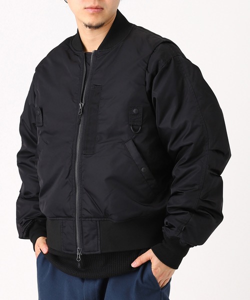 タテ糸100デニール×ヨコ糸200デニールを使用した高密度ナイロンツイル素材。肉厚過ぎない中厚地を採用。軽量性、破れにくい特長を持った頑丈な素材。アメリカ軍の初期型MA-1フライトジャケットを彷彿とさせるダウンジャケットをアレンジ、袖をデタッチャブル仕様にし、ベストとしても着用が可能なデザインに昇華。フライトジャケットのディテールである、酸素マスクを留めておくためのオキシジェンタブは胸ポケットに、両脇に備えられた当時ICSの音声プラグコードの固定用コードループは釣果を記載する際の1本分のペン差しとしてそれぞれアレンジ。インナーには複数のインサイドポケットを配しており、十分な収納力を持ち合わせている。ミリタリーのディテールでもある前振りの袖がデザインアクセント、アクションプリーツを加え、腕の可動域を広げられるように考えたデザイン。