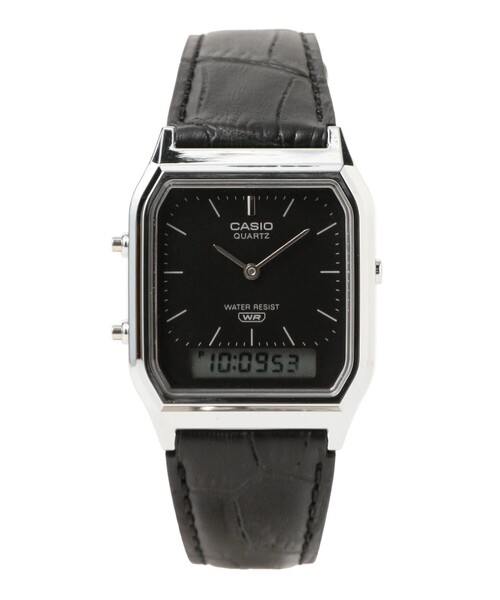 型押しのバンドがクラシカルなひと品 ■デザイン ヴィンテージ感溢れるアナログ・デジタルコンビネーションモデル。ベースとなる〈CASIO(カシオ)〉の人気モデル「AQ-230」は、角型フェイスにアナログ時計とデジタル表示を組み合わせ、クラシックなスタイルに便利な機能を加えたひと品です。シルバーケースにブラックレザーバンドを組み合わせ、モダンで洗練された印象に仕上げています。 ■ディテール 日常生活用防水機能、ストップウォッチ、アラームなど、機能面も充実。バンドにはクラシカルな型押しデザインが施され、細部にまでこだわりが感じられます。シンプルでありながら高級感を漂わせる仕上がりが、さりげなく上質さを演出します。 【仕様・詳細】 ・日常生活防水 ・ストップウォッチ(1/100秒 60分計) ・時刻アラーム ・オートカレンダー ■メーカー品番 AQ-230EL-1AJF G-SHOCK 1983年、頑丈で壊れない時計として誕生した「G-SHOCK」。以後、タフネスを追及して様々な進化を遂げて世界中で愛用されています。