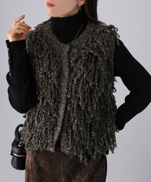 【Riberry フリンジニットベスト】\羽織るだけで今っぽく決まる!/ 表情豊かなループヤーンで、スタイリングに遊び心をプラスしてくれるニットベスト♪■Stylingふわっとしたボリューム感と存在感のあるループヤーン素材が印象的なニットベストが登場しました。一つひとつの糸に立体的なループが施されており、動くたびに表情の変わるリッチな風合いが魅力です。フロントはスナップボタンで開閉でき、ベストとしても羽織りとしても楽しめる2WAY仕様。中はロンTやシアートップスで合わせたり、タートルニットやシャツ、ワンピースとキレイ目アイテムと合わせるのもオススメ◎程よくオーバーなシルエットで、厚手のインナーともレイヤードしやすく、抜け感のあるスタイリングが叶います!秋冬のスタイリングに立体感と遊び心をプラスしてくれる主役級アイテムです♪■Detailフロントはワンタッチで開け閉めができるスナップボタン使用で着脱も楽ちん!ベストとしてもジレ風の羽織としても着れるのでコーデに合わせて着用いただけます。長すぎず短すぎない丈感とややゆったりシルエットで、1枚着でもインナーとのレイヤードでもバランス良く着れるのが嬉しいポイント◎程よい厚みで着ぶくれしにくく、ロングシーズン活躍可能な生地感です♪■Material軽く柔らかなポリエステル素材を使用しており、見た目のボリュームに反して軽やかな着心地もポイント。チクチク感が少なく、ニット特有のごわつきも気にならない快適な着用感です。合わせ方次第で秋口から春先までロングシーズン着回せます♪▽生地感透け感:あり 〇〇〇●〇 なし生地の厚さ:厚い 〇●〇〇〇 薄い裏地:なし伸縮性:あり※この素材は性質上、発汗、摩擦等により、ほかの衣料やバッグなどに多少色落ちや色移りする場合がありますので、十分にご注意下さい。※商品の梱包には細心の注意を払っていますが、通販の特性上、到着時に畳みシワがついている可能性がございます。予めご了承ください。※お肌のデリケートな方は刺激を感じる場合がございます。※詳しいお手入れ方法は商品タグをご参照ください。【Information】◆《お気に入り登録》がオススメ◆・「商品のお気に入り登録」で再入荷通知や、ラストの通知、セール通知も受け取ることが出来ます。・「ブランドのお気に入り登録」で新商品や再入荷など、お得な情報を受け取ることが出来ます※撮影時のライティング、太陽光、ご覧になっているモニター・PC環境により、実際の商品と色味が異なって見える場合がございます。予めご了承をお願い致します。
