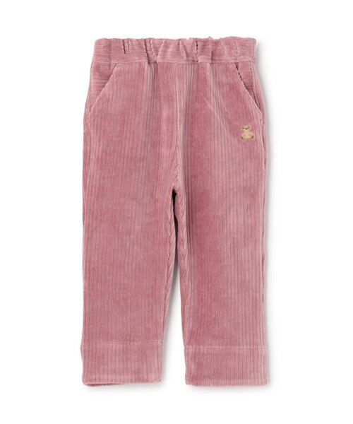 太めのうねが魅力的なニットコール生地のロングパンツです。 高い伸縮性で動きやすく、やわらかな肌触りのためはき心地も快適。 くまのお顔をデザインしたバックポケットと、テディベアの刺しゅうに心惹かれます。 裾にはボーダー柄の見返しがついており、折り上げる着こなしもおすすめ。 ウエストはサイズを調節できるボタンホールゴム仕様です。 内側にお名前を記入できるタグつき。 【おすすめの着用時期は秋冬シーズン】 【透け感】透けない 【生地の厚さ】厚い 【伸縮性】あり 【裏地】なし 【ポケット】あり 【アジャスター】あり